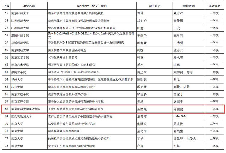 近日,由江苏省教育厅高等教育处组织的2017年江苏省普通高等教育本专科优秀毕业设计(论文)评选中,我院预防医学专业王圆媛的毕业论文《子代出生体重与巨大儿的孕妇代谢特征研究》(指导教师:陈敏健)获得一等奖。