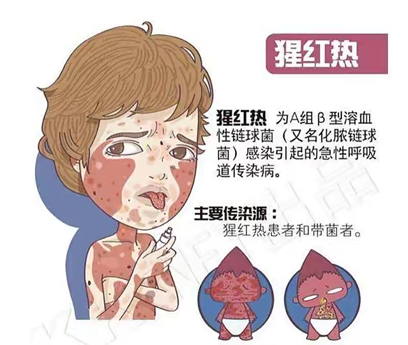 猩红热(Scarlet Fever)为A群溶血性链球菌感染引起的急性呼吸道传染病,临床特点为起病急、发热、咽峡炎、弥漫性皮疹、继而脱皮。其传染源是患者和健康带菌者,通过空气飞沫传播细菌。猩红热的病原为革兰染色阳性A组β溶血性链球菌,该菌在体外的生活力较强,在痰液、脓液和渗出物中能生存数周,在60℃环境下30分钟、碘酊中15分钟可以灭活。