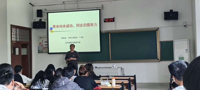 江阿沛老师首先介绍了我院对预防医学专业学生的培养目标、知识要求、修业年限、学年教学、主干学科和核心课程,特别对定向就业协议书的内容进行了重点讲解和提醒。刘永友老师以“革命尚未成功,同志仍需努力”作为开场,向22级和23级卫检班的同学们介绍了专业课程模块、毕业要求、学位要求、对口的岗位等,希望同学们保持初心,踏踏实实地走好大学的每一步。