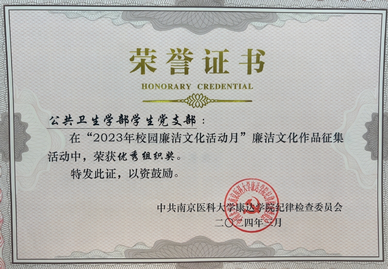 公共卫生学部学生党支部已连续两次获得此奖项。这是公共卫生学部开展学生廉洁文化建设的一个缩影,也是推进我部高质量发展清廉智慧和力量的有力举措。今后,公共卫生学部将立足主责,打牢党风廉政建设基础,继续以“廉洁”为切入点,积极探索廉洁文化传播的新途径、新方法,弘扬廉洁文化,充分发挥出“倡廉于有形、润物于无声”的作用,不断增强党员和学生廉洁自律意识和拒腐防变能力。